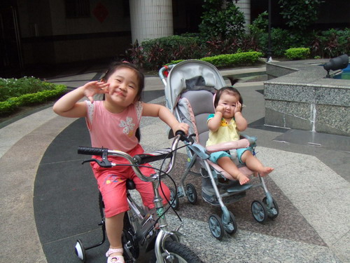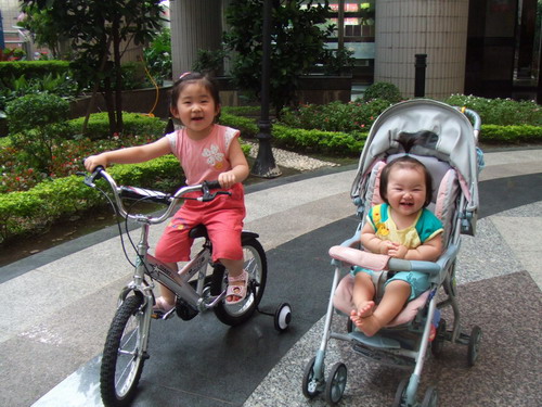 媽媽陪我們在中庭騎車,