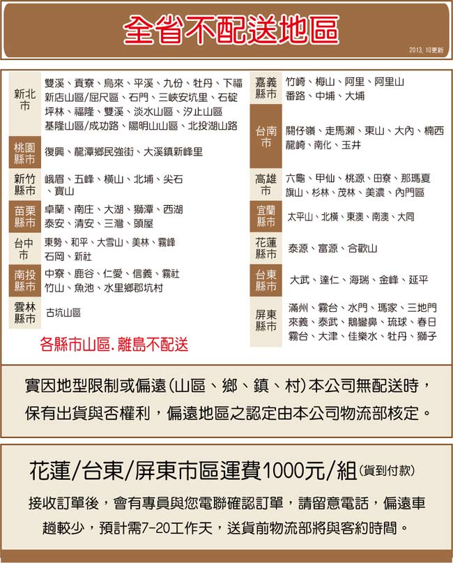 服務,特此告知。(5)配送範圍:台灣本島。外島、離島不接單。實因特殊地型限制偏遠