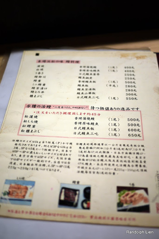 上面各項價格都寫得很清楚了,中間框起來就是該店家絕活 - 現殺現烤鰻魚,上方則是使用一般已經先行處理過的鰻魚半成品,這點就跟其他店家都一樣了。(註:就是一般在養殖場或者配送廠,先行宰殺燙熟,然後送至各餐廳,店家再將半成品沾醬燒烤而成)
