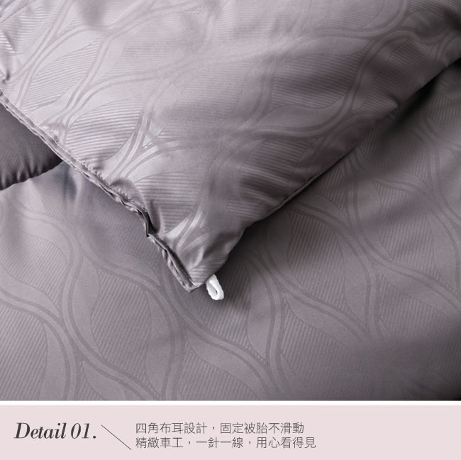 被胎四角布耳綁繩可與被套固定,讓被胎裝入被套內不會任意滑動,貼心的格狀絎縫車工,讓棉芯不易糾結,使用起來更舒適。