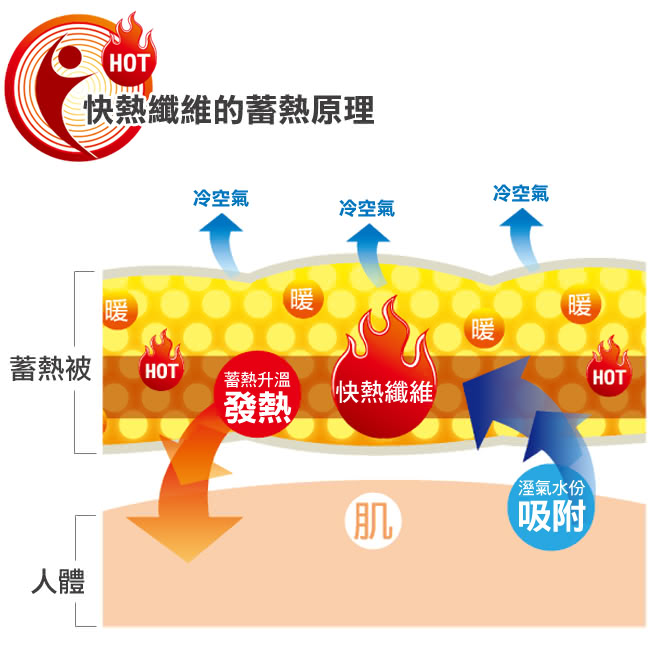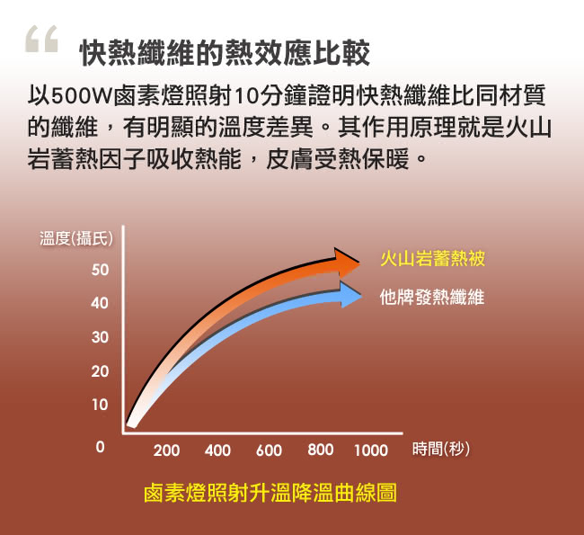 採用台灣製造之華楙快熱紗纖維,於纖維的製造過程中添加火山岩奈米複合粉體,能吸收人體體溫,並釋放熱能使被胎內部增加保暖性能,蓄熱保溫效果優異。