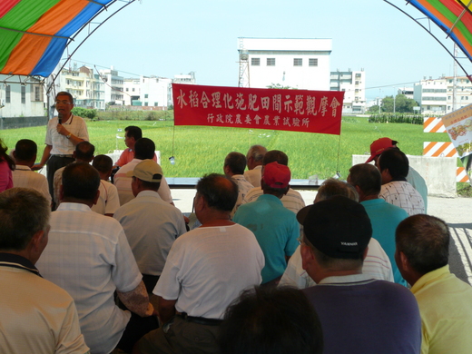 講解人講到施肥過程,哪一種肥料成份在什麼情況下施肥是往地下吸收及空氣中吸收的一些原理。最後觀摩會旁就有示範的稻田讓現場的農友下田參觀。