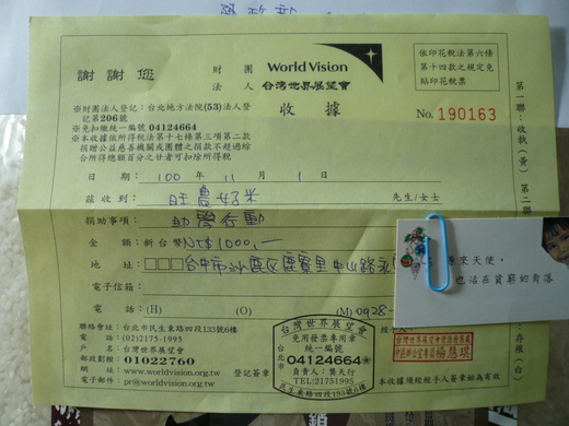 2011年10月26日是斑馬自產自銷米店開店第100天,時間過得真快,一下就100天,當天早上查詢了一下捐款單位,下午前往沙鹿區的世界展望會捐款,不過很巧,當天剛好員工開會三天,得要下星期一才有回來,於是就星期一(10/31)再前往捐款,今天中午(11/3)掛號收據來囉。