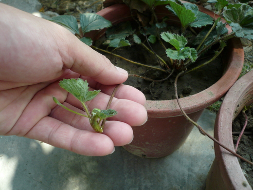 斑馬教大家把草莓從原來的一株變多株,如有以前買回來種的草莓盆栽,或種在平地土壤上都可以,大約在九月份,氣溫開始下降,草莓會開始長出嫩葉,也會延長出嫩苗(中圖),準備好盆栽裝七分滿土壤,把延長出來的幼苗放到土壤上,澆點水,根部會自已慢慢往土壤延伸下去,大約十天後再拿剪刀把延伸出來的剪斷(下圖),步驟很簡單,這樣就完成,大家就有吃不完的草莓囉,更多分株草莓照片請看住家隔壁花果園相簿。