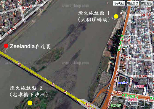 今年國慶煙火施放輪回台北市, 地點共兩處: 大稻埕碼頭及忠孝橋下台北市那頭的沙洲 (如上圖所示. 衛星地圖取自UrMap你的地圖網). 直覺大稻埕碼頭對岸的環河運動公園會是最佳觀賞點, 特地帶著愛妻載了兩輛單車, 將車停在重新橋下疏洪道裏停車場, 再換騎單車過去, 免去塞車之苦.