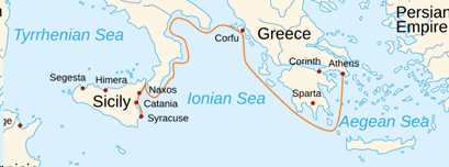 前往敘拉古的海路從雅典要繞過伯羅奔尼薩半島南端,沿伊奧尼亞(Ionian)海岸航行,大約需要三四天。