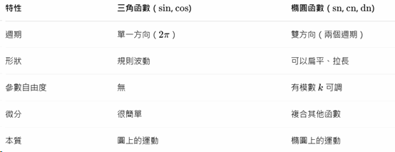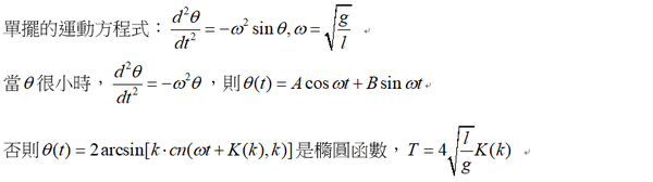 擺動角度不大時,單擺作週期運動,是正餘弦函數,否則就是橢圓函數。 橢圓函數是雙週期有點複雜。