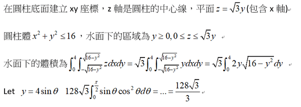 水面剛好通過底面直徑且與底面成 。求此圓柱體在水面下的體積。
