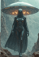 飛碟外殼覆滿米諾斯符文,表面有如流動的銀;駕駛它的方法不是機械,而是意念與古老語言的呼應。