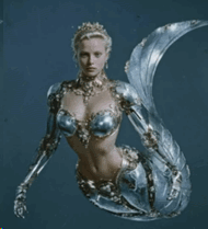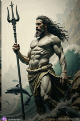他上身為俊朗青年,下身卻是覆滿青藍鱗片的魚尾,肌肉如海浪雕琢,手中持著一柄螺殼鑄成的三叉戟。