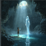 天頂裂開細縫,光從那裡灑下,照在水潭上。