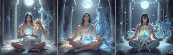 月光下,瑠珂與畢達哥拉斯依偎在一起,水精靈如輕紗般環繞,三種不同的存在形式和諧共處,彷彿預示著一個更加宏大的可能性——