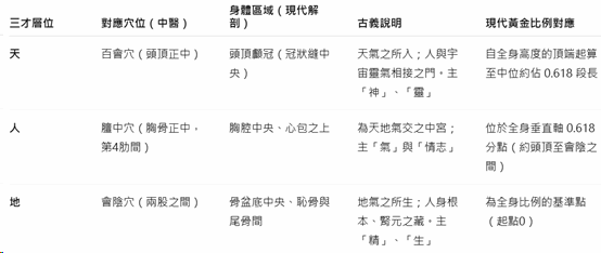 (1) 從會陰(地)到膻中(人)的距離約為 0.618 × 全身高度;