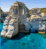 德洛斯的純白大理石與精神上的高揚,逐漸被米洛斯島上色彩斑斕、嶙峋粗獷的岩層所取代。