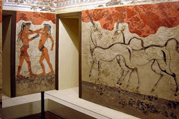 他進入一座保存良好的宅院,室內光線柔和,牆上的壁畫描繪著躍動的海豚、羚羊、漁夫、拳擊兒童、鮮紅的番紅花採集者,以及以大步疾行姿態呈現的藍衣男子。