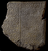 拿布–扎卡里指著刻著細密符號的泥板(cuneiform tablet)說:
