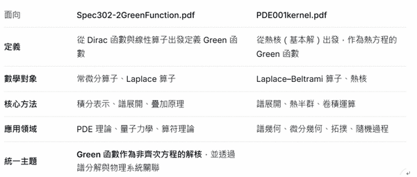 兩者共同的核心是: Green 函數是對應線性算子的基本解,可透過疊加原理建構一般解,並與算子的譜理論密切相關。