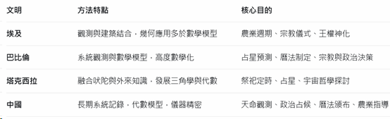 巴比倫與印度偏重數學模型與週期計算;中國與埃及更注重實用與政治宗教功能。