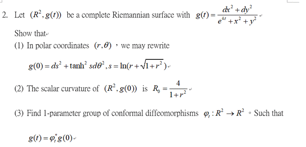 高斯曲率,共形變換,如何把一個metric拉回,one parameter group of conformal diffeomorphism, conformal Killing field,Ricci flow...