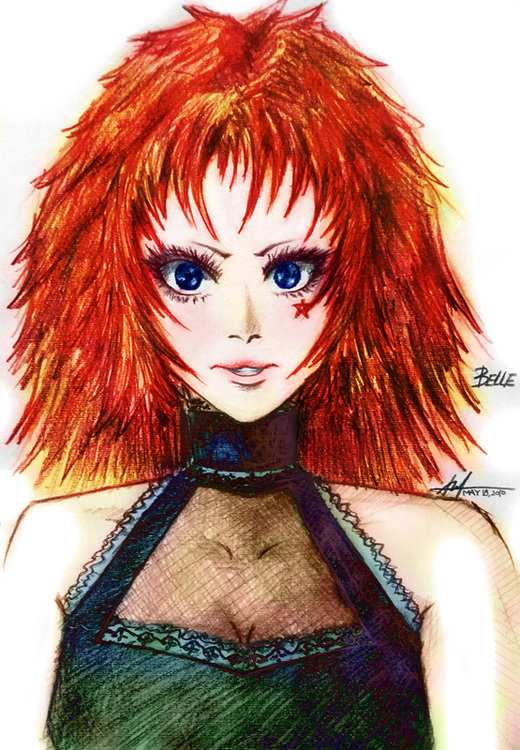 就從看到她的瞬間,我就覺得她和小司或其它的天使有點不一樣:除了她那像陽光般有親和力的笑容外,表情更豐富更像是人類一般,這點從她打招呼的方式就感覺得出來。她身形很嬌小,身高大概不過一百五十公分,秀緻的五官,眉目間卻英氣凌人。一頭橘紅色挑染的短髮讓她更顯得有活力,左臉的眼睛下,甚至有個小小的星形刺青。