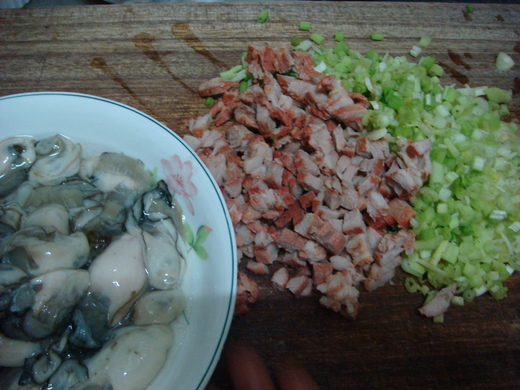 【2】加入洗淨的蚵仔 → 加入其他吃剩的菜或肉(肉要切細)→ 拌勻