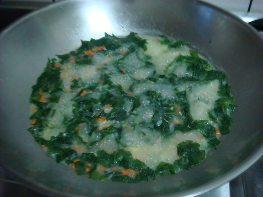 【1】地瓜葉(胡蘿蔔或同屬性的…)切細 + 剩飯 + 水 → 在鍋中煮滾