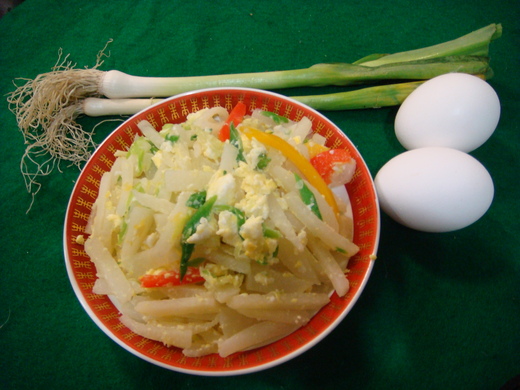 材料:豆仔薯一個 雞蛋二個 青蒜一枝 雞 蛋 甜椒