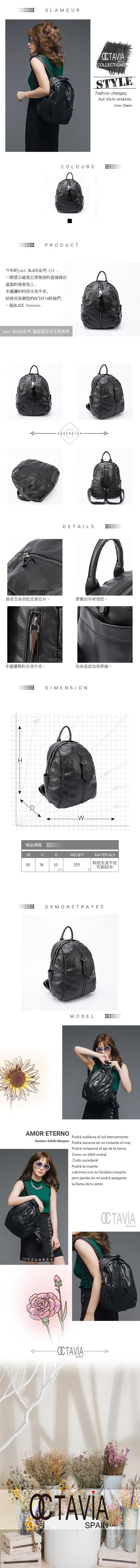 - ◎今年的just BLACK系列 III - 一眼望去就是它很叛逆的直線條在蛋型的後背包上, 手感優的科技水洗牛皮, 給俏皮具個性的OCTAVIA粉絲們,一起BLACK forever.