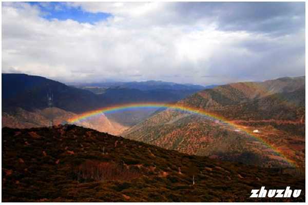 彩虹低低地劃過,小河泛著粼光,山巒呈金黃的暖色