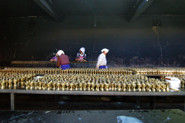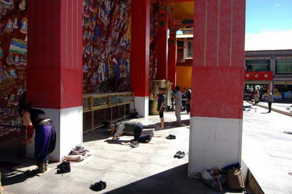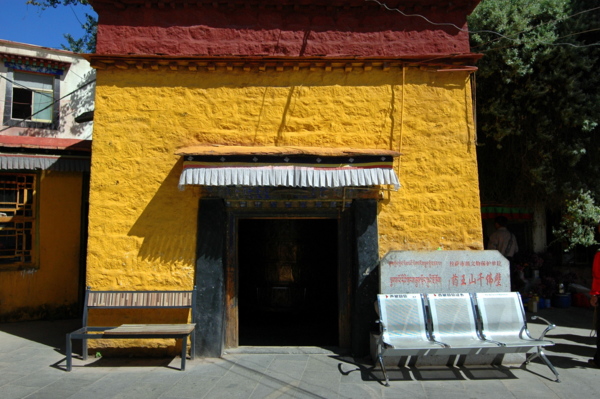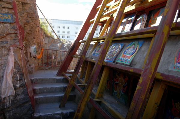 雖然還不到中午,但拉薩的陽光已相當炙烈。與布達拉宮咫尺相對的藥王山,沐浴著日光,前來轉經朝拜的信徒絡繹不絕。小巷桑煙裊裊、藏香氤氳;循著巷子行至盡頭,便是「千佛崖」了。在這短短百來公尺黃色高牆夾持的小巷,除了信徒外,就只有我和團友一行四人手中拿著相機,是典型的旅人外貌。千佛崖門口是「擦擦」聚集地,大約有10多家手工作坊匯聚於此;所謂「擦擦」,是指藏族的一種脫模泥塑藝術,通常會用泥製成各種佛塔、佛像等,並附著彩繪。