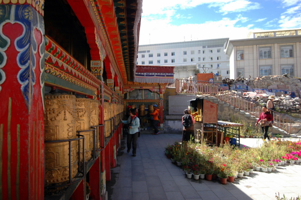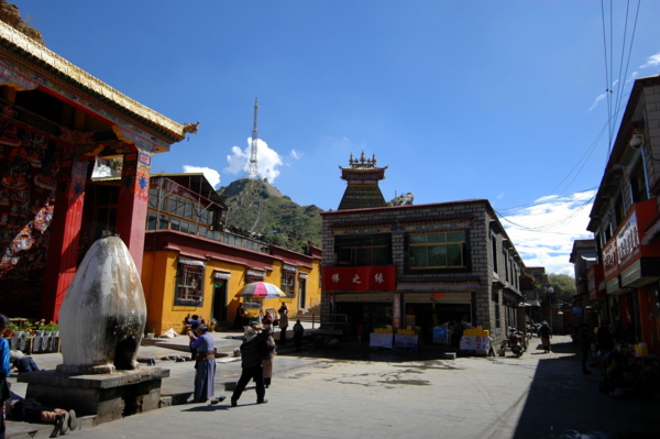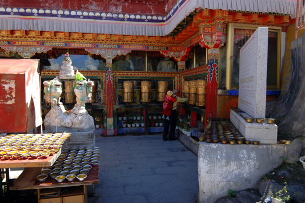 穿過這些作坊,便看到成排的金色轉經筒,在信徒的撥轉下隆隆旋轉;桑煙混合著人們虔誠的祈禱,循著崖壁緩緩升騰。轉經筒有大有小,小的拿在手中即可,這種手搖轉經筒,又叫作手搖瑪尼輪,質地有金、銀、銅等,也分大中小幾種。這種可以拿在手中的轉經筒,主體呈圓柱形,中間有軸以便轉動;不僅圓筒上刻有藏傳佛教的六字真言,圓筒中間同樣裝著經咒,藉著旋轉經筒,祈福消災。