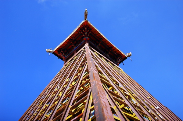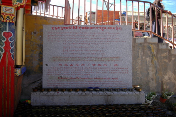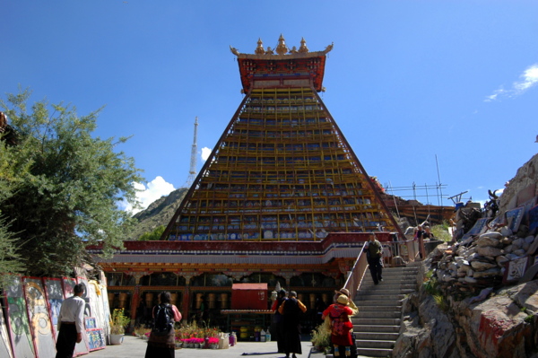 至於「甘珠爾」石經塔,則是矗立在千佛崖後的一座高塔。《甘珠爾》是藏傳佛教重要經籍,是西藏文化藝術寶庫一顆璀璨無比的明珠,它集三藏三大成,共108部。由本·土巴大師,刻在花紋石上,以流傳萬世。面向壁畫的右手邊攀登石階,就會看到「甘珠爾石經塔」,工匠將整部《甘珠爾》雕刻在石板上,並將石板堆砌形成這座寶塔。人們在山上堆滿印好經文的石碑以及牛頭骨等信物,並以額頭觸碰祈福,默誦真言,雙手合十,觸額、觸口、觸胸,五體投地匍匐……。