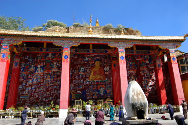 信眾俯身叩拜的這面牆體,約有兩層樓高,上面密密麻麻刻滿上千個色彩豔麗、大小不一、形態各異的佛像,這就是西藏最古老的摩崖石刻千佛崖了。很多佛像雕刻的非常之高,千萬尊佛像覆蓋了整個山體;雖然「千佛」的稱呼只是形容這裡的佛像之多,但其實山壁上大大小小的佛像早已超過了千座。據說,現在藥王山的佛像石刻已超過五千座,這些石刻造像也都是西藏石刻藝術中的精華。