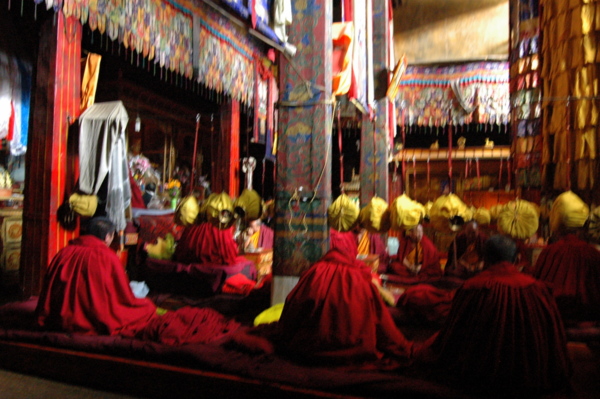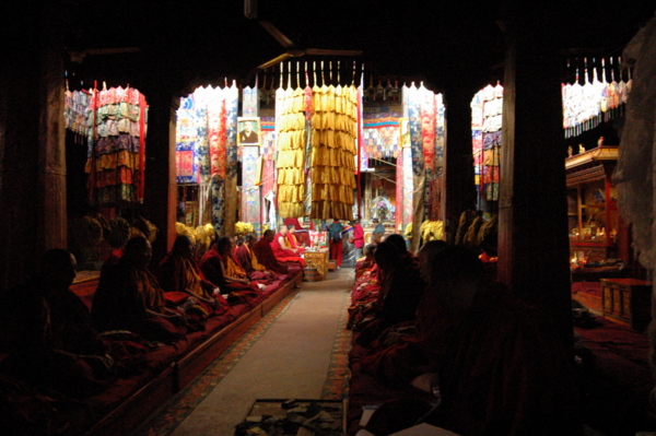 門庭後面為經堂,進深7間面闊3間,30柱,柱下皆有石柱礎。其中中部4根大柱直通二層之上撐起高敞天窗。柱高6.2公尺,直徑0.46公尺;其餘26根柱子高2.8公尺,直徑0.48公尺。柱頭皆為卷雲紋、寶珠、蓮花紋等雕飾。集會堂天井正對的一排檁頭上原雕有28只臥獅,現存27只,係全雕和半雕;腹腔上有底座,裝飾四瓣或八瓣蓮花。集會堂四壁曾遍繪釋迦牟尼、千尊佛等。西後淨室門口南面供塑有捨利弗與目犍連兩大弟子孫靈塔及高0.4公尺的銅鎏金密集金剛造像、泥塑的傑尊·貢嘎頓珠造像;北面供有高1公尺的吉祥金剛怖和能仁佛、藏巴拉等佛像。