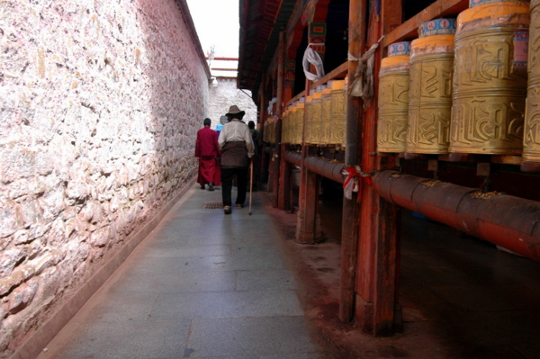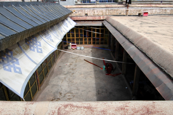 明廓後部壁上繪有四大金剛(即四大天王)和六道輪迴圖,棕色的兇惡明王抱著一個巨大的車輪,巨齒獠牙銜著輪的上部;大輪分成三層,圓心畫蛇、鳩、豬等,內輪分為六格,即六道,最外層又有十二個畫面,稱「十十緣起支」:即無明、行、識、名色、六處、觸、受、愛、取、有、生、老死)、極樂世界圖等壁畫;門樓二三層是僧房和經堂等。穿過門樓即是繞神殿一周的轉經迴廊。迴廊南、西、北三面豎有木製嘛呢輪,廓壁上也遍繪無量壽佛、白度母等壁畫。
