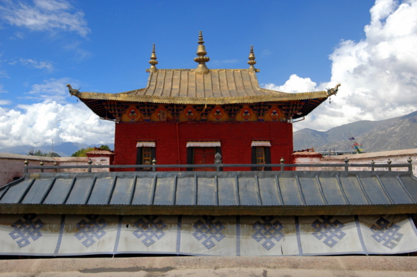 佛殿後部和兩側還繞以密閉回廓,偏窄、較高,具有早期佈局特徵。神殿第二層前前為僧舍,中部為大經堂天井,天井之後為供佛大殿,6柱,內供桑傑魯王甲後、十六尊者及經書;裡面還有一大殿,8柱,內供藥師八如來和《甘珠爾》佛典,北面供奉有救度母及其他佛像。神殿第三層前面為達賴喇嘛到該寺的專用住房,共6間。後部則為金頂殿,殿門向東,面積約54.5平方公尺,內有明柱兩排8根,左右開小窗。殿左右及後部有一周狹窄回廓,以木欄相圍。金頂為漢式風格,屬歇山式,以鬥栱承托;金頂垂脊末端套有羯摩魚頭,是為套獸。殿內門窗壁畫、柱子等則是藏式風格,體現了藏漢建築的巧妙結合。