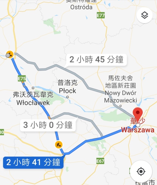 從托倫到華沙,有三條道路可選擇,若在斯特雷庫夫從E75公路轉A2高速公路,距離262公里;加上中途休息,約三個小時路程可到。由於這段東南行轉東行的路段,仍然行駛在中歐大平原上;路旁仍然是一望無際的田野,最值得一拍的就是穿插其間的村莊,特別是高塔教堂聳立地平線,搭配紅、黑為主色的斜頂民居。這就是出國旅遊所要尋找的感覺,一種完全不同於家鄉的地景風貌,新鮮之外還讓旅人透著好奇-街巷與村庄田野間的教堂與宮廟,除了神祉外又有何不同?