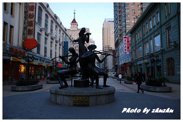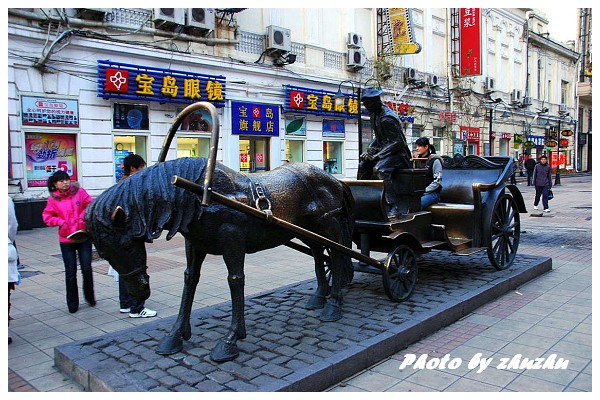 中央大街每隔一段,還有一些雕塑,看起來很優雅的雕塑。有的人在街上棠槭樹的林蔭下,一邊踱著輕鬆的緩步,觀看街道兩旁的歐式建築,一邊欣賞著這些雕塑。最引起我注意的是「馬車與車夫」青銅雕像,老車夫沉靜的臉上刻著歲月的滄桑,他緊鎖著的眉頭好像在向人們訴說著生活的艱辛。當我腳踏著花崗石拼排起來的馬路,望著街兩旁風格迥異的各種建築,心中不由漾起片片美的漣漪。