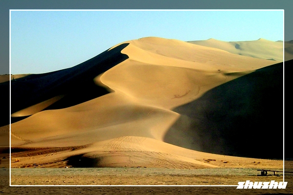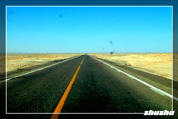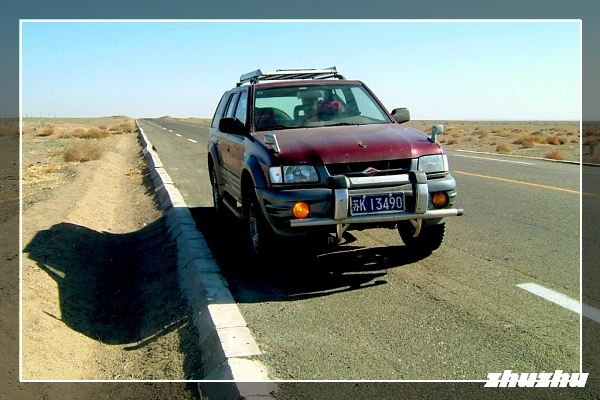 越野車車左轉215國道,雖是雙線道但路面略窄,仍全線瀝青路面,直直一條巨龍向遠方無線延伸,記憶中好像只轉了兩、三個小彎,方向盤及油門就像突然失去功能般擺在那兒!此時越野車隨國道路面往遠方輾進,太陽直直的在正前方往車內照射,拉下遮陽板才看到溫度表指針已指在攝氏50度C。戈壁反射的陽光也往車內湧來,四際都是發亮平坦的典型戈壁沙漠景觀。
