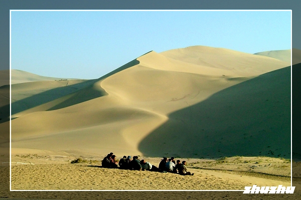在遊客服務中心的DM簡介:「晴空萬里蔚藍天,美絕人寰月牙泉,銀山四面沙環抱,一池清水綠漪漣」。遊客在這裡可以赤足爬山、滑沙,騎駝登沙丘,也可以滑板滑沙、跳牽引傘,進行沙浴、沙療,情趣盎然。不過來前查看資料,知道現在這個月牙泉,早已不是當初的月牙泉,現在完全是爲了旅遊的需要搬了家,連泉水也是人造的了………!以上美好形容句子,都是旅遊宣傳的資料抄載。