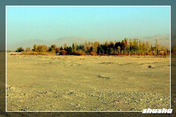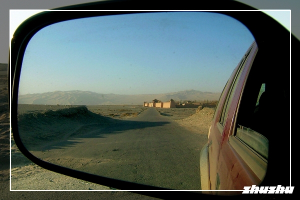 傍晚五時,回到停車場上車走人,走陽關中路西行,決定去看「西出陽關無故人」的「陽關遺址」。車又回到215國道,往西行在經過一村落處,很意外的有交警及保安攔車,由於當時夕陽西下,逆光下視線不清,再想到在大陸能走則走、能不停車絕不停車的自保原則,遂輕打方向盤稍閃讓攔車的保安便絕塵而去,從後視鏡中,可看到那保安指著越野車大罵,想必不是什麼好聽的言語。