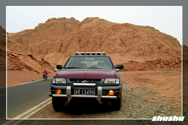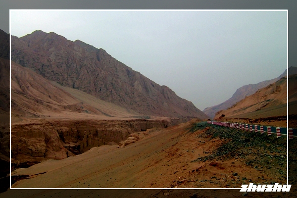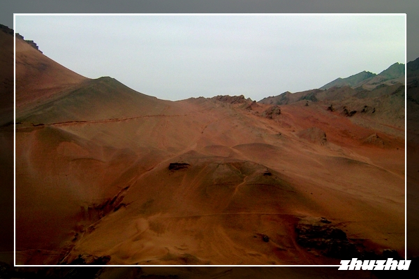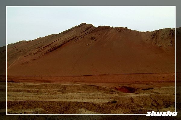山谷旁的山峰主要由紅砂石構成,山體上儘是火山岩漿流過的痕跡,峽谷中的土壤也是呈黃紅色。於是不禁想到,人們常問的呉承恩筆下「西遊記」中,孫悟空大戰牛魔王與鐵扇公主的火焰山何在?我想這一片紅色山巒,應該就可以稱為當年他們大戰的「火焰山」吧!這裡是新疆境內吐魯番盆地北緣大峽谷中的一片山區;山不在高,有仙則名,大名鼎鼎火焰山應當就是這樣的一座山。