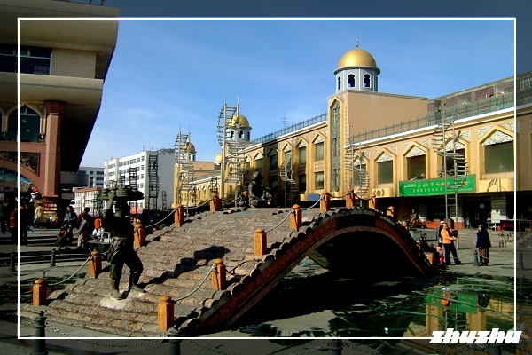 出維吾爾自治區博物館,下午四點多回到酒店,將車停在酒店停車場,再打的士到國際大巴扎。巴扎就是「市集」、「貿易市場」「大商城」的意思,烏魯木齊有巴扎十餘處,大小規模不一;規模較大的有紅山巴扎、紅旗路巴扎、二道橋巴扎;其中又以二道橋巴扎最富有維吾爾族的民族特色。國際大巴扎就在「二道橋巴扎」對面,彼此隔街相望;二者差別在一是自然形成的市集,一是觀光景區。