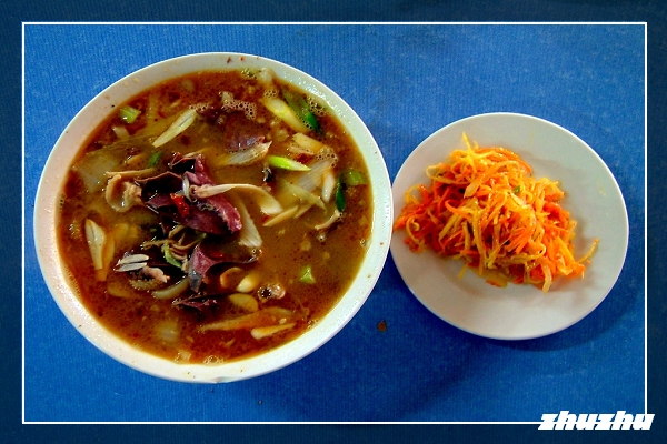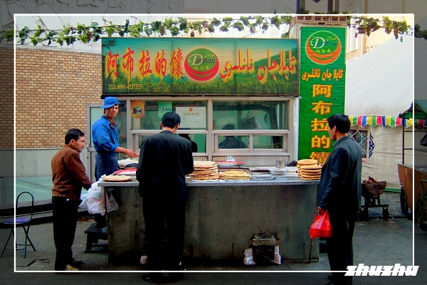 這裡有名的小吃如阿不拉的饢、烤包子、過油肉拌面、抓飯、烤羊肉串、涼皮子、羊蹄子、饊子等地方小吃都深具特色。我首先在飲食攤點了羊雜湯6元,為自己買了雙內襯羊毛的半統休閒鞋50元,也為自己和女兒買了帶羊毛的皮手套,從85元喊價殺到50元一雙,是否便宜不知道,最起碼在台灣是沒這些便宜的好東西。羊毛圍巾也是囊中之物,挑來選去十幾條了還是不夠分的,一個大男人好像要將店老闆的貨翻個遍,在旁人怪異眼神下方才收手。