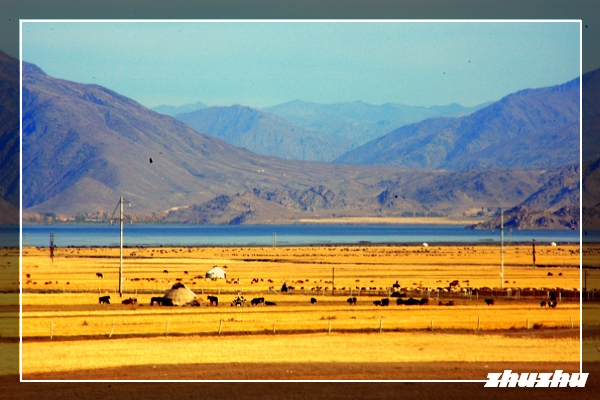 南湖濱煙波浩渺,湖面波光瀲灩,深淺變幻有如色染,相依一個開闊的大草原-綠草如茵,村舍散落,氈房星點,牛羊遍佈,又倒映於湖中;近處三三兩兩的牧馬,還有成群的羊兒在靜靜地吃草,讓整個畫面更加和諧靈動。悄悄地步步逼近羊群,毛色各異的牠們如同一個聯合國大家庭,互相依偎著,追隨著,慢悠悠地吃著草,吃累了就躺著曬會太陽,感覺安詳而純淨,一派阿勒泰草原風光。