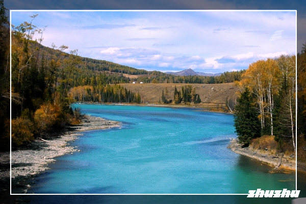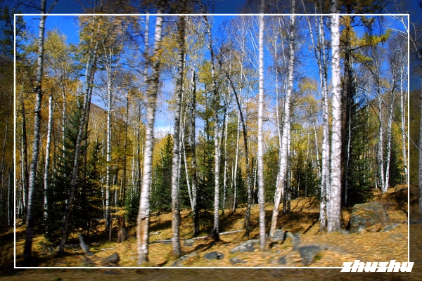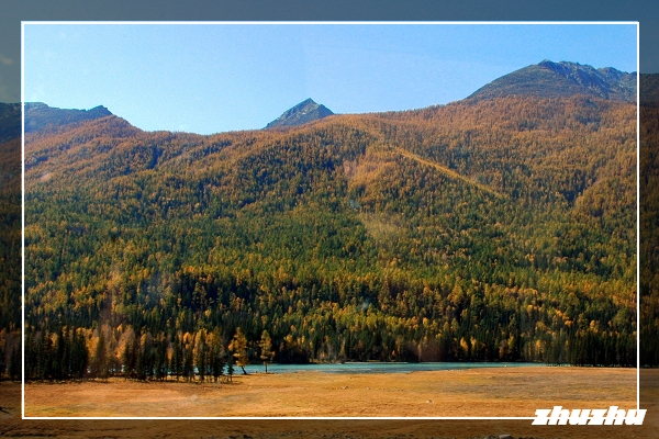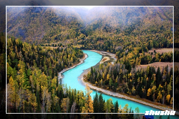 搭乘景區的大巴士車,進入喀納斯景區,路況甚佳;過了邊防站不遠,便猶如進入了一片金色的地域-天高雲淡,藍天如洗,層林盡染,滿目流金,深黃的山坡上透出一片片黃枝紅葉相間、青山白雪相連的色塊。沿途的白樺、紅松、冷杉等樹木會以金黃、橙紅、黛綠等交叉的色彩,烘托著山頂耀眼的雪色,投映在翡翠石般的喀納斯河上,光彩奪目,令人沉醉,此時真是攝影的最佳時節。