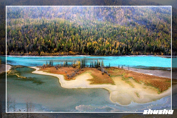 再度上車往喀納斯方向大約3公里處有一片河灘,這裏的河水將森林和草地切分成一塊塊似連似斷的小島,人稱神仙灣。神仙灣是喀納斯湖在山澗低緩處形成的一處沼澤淺灘。湖面背光,看過去在陽光照射下閃著細碎的粼光,仿佛無數珍珠在此被任意灑落,由此也稱它為珍珠灘。加上此地常有雲霧繚繞、超凡脫俗、如夢如幻,山景,湖水,樹木相映,煙波飄渺,如臨仙境,神仙灣由此得名。