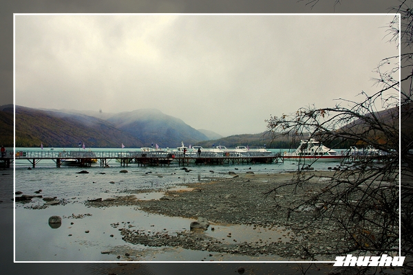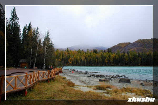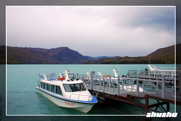 下了觀魚台,再搭乘小巴士車前往遊艇碼頭搭乘遊艇。前往遊艇碼頭的一路也很美,金色的白樺,木刻楞小屋,悠閒的牛羊,遠處的雪山,美景無處不在。到湖邊的乘船碼頭必須要穿過一片密密樹林,為了不破壞樹林和植被,專門鋪設了木板拼接的遊覽棧道;棧道木板寬窄顏色一致,猛一看似乎很講究,但設計容易讓人視覺疲勞,上下臺階之間沒有明顯的標誌,很容易讓遊客一不留神踏空而摔倒。