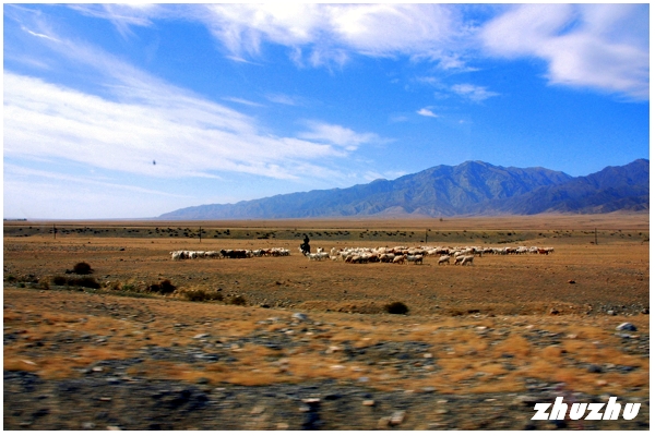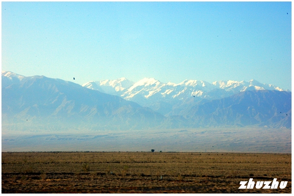 車窗外的景色,右側一如這二天所看到的荒蕪山丘,戈壁,沙漠,讓人提不起興趣。好在左側直到天山山麓,有大片的草場和農作農場,從車窗外轉瞬即逝。車子進入天山山脈之後,漸漸的開始看到連綿的雪山。一路飛奔,新疆的公路特別的好,又寬又直,又沒人,隨便一踩油都可以開