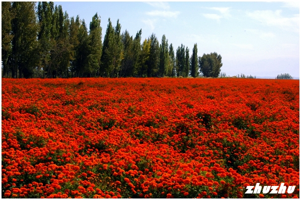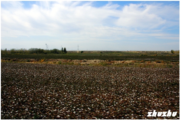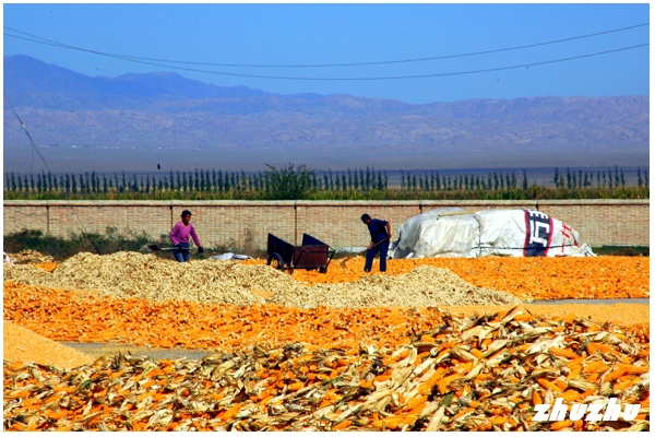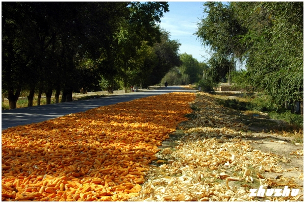 出精河縣城,接上S305省道,轉接S205省道,這二段省道路況都還不錯,路面大致平整;不過雖是二線道路面,但是由於此地是新疆生產建設兵團農五師八十四團的農墾區,現正是秋收時刻,省道旁大片的棉花田,向日葵及玉蜀黍大豐收,都堆置在省道上曝曬以便冬藏;不單使得原本二線道僅剩一線道可供車輛使用,而且收集農作物的拖拉機,在路上慢吞吞的行駛,都使得行車速度受到影響。